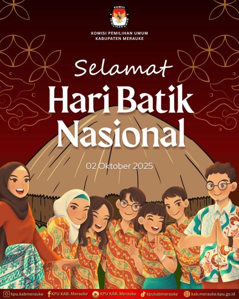 #TemanPemilih, KPU Kabupaten Merauke mengucapkan Selamat Hari Batik Nasional, Kamis 02 Oktober 2025. Batik merupakan warisan budaya luhur bangsa Indonesia yang sarat dengan nilai, makna, serta filosofi mendalam. Sebagai identitas dan kebanggaan bangsa yang telah diakui dunia, mari kita bersama-sama melestarikan dan memaknai batik sebagai simbol persatuan, keindahan, dan jati diri Indonesia. #KPUMelayani #KPUKabupatenMerauke ....