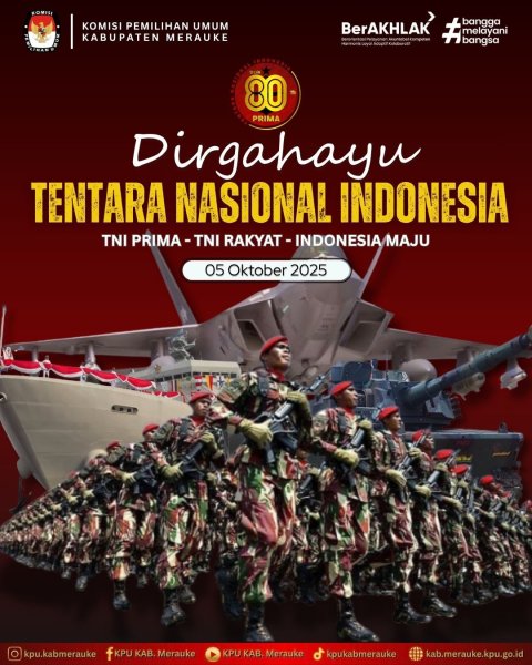 #TemanPemilih, Komisi Pemilihan Umum Kabupaten Merauke mengucapkan Dirgahayu Tentara Nasional Indonesia ke-80. (05/10/2025) Semoga Tentara Nasional Indonesia senantiasa menjadi garda terdepan dalam menjaga kedaulatan, keutuhan, dan keamanan Negara Kesatuan Republik Indonesia. Melalui semangat TNI yang profesional, responsif, integratif, modern, dan adaptif, mari bersama kita wujudkan Indonesia yang semakin maju, kuat, dan berdaulat. TNI PRIMA – TNI RAKYAT – INDONESIA MAJU #KPUMelayani #KPUKabupatenMerauke ....