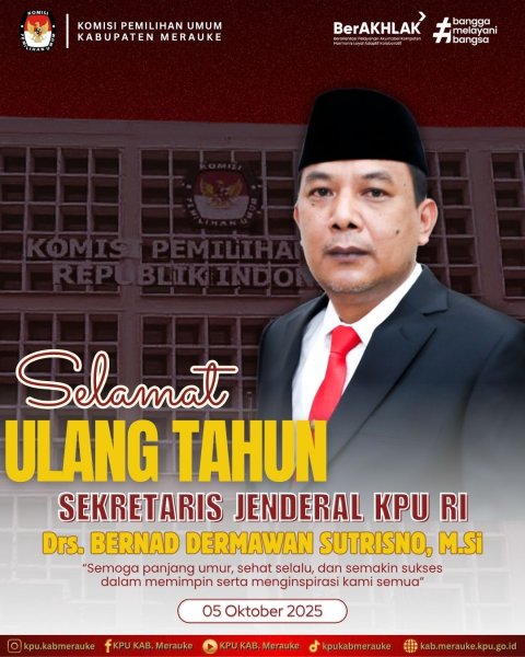 #TemanPemilih, Komisi Pemilihan Umum Kabupaten Merauke mengucapkan Selamat Ulang Tahun kepada Sekretaris Jenderal Komisi Pemilihan Umum Republik Indonesia, Bapak Drs. Bernad Dermawan Sutrisno, M.Si. (05/10/2025) Semoga senantiasa diberikan kesehatan, kebahagiaan, dan keberkahan dalam setiap langkah pengabdian. Di bawah kepemimpinan Bapak, semoga KPU terus menjadi lembaga yang profesional, transparan, dan berintegritas dalam melayani demokrasi Indonesia. #KPUMelayani #KPUKabupatenMerauke ....