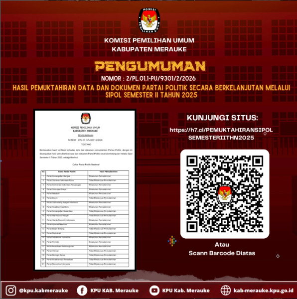 #TemanPemilih, KPU Kabupaten Merauke mengeluarkan Pengumuman Hasil Pemuktahiran Data Partai Politik Berkelanjutan melalui SIPOL Semester II Tahun 2025.