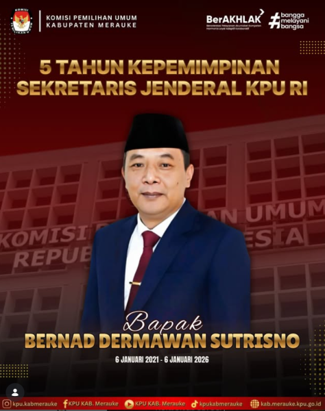#TemanPemilih, Keluarga Besar Komisi Pemilihan Umum Kabupaten Merauke mengucapkan selamat dan sukses atas 5 tahun kepemimpinan Sekretaris Jenderal KPU RI, Bapak Bernad Dermawan Sutrisno, periode 6 Januari 2021 – 6 Januari 2026. Semoga kepemimpinan dan pengabdian yang telah dijalankan menjadi fondasi yang kuat bagi keberlanjutan tata kelola kelembagaan KPU yang profesional, berintegritas, dan semakin dipercaya publik, serta terus memberikan dampak positif bagi penyelenggaraan demokrasi di Indonesia. #KPUMelayani #KPUKabupatenMerauke ....