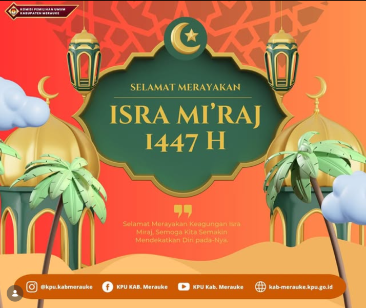 #TemanPemilih, Segenap Keluarga Besar Komisi Pemilihan Umum Kabupaten Merauke mengucapkan Selamat Memperingati Isra Mi’raj Nabi Muhammad SAW 1447 Hijriah, yang jatuh pada 27 Rajab 1