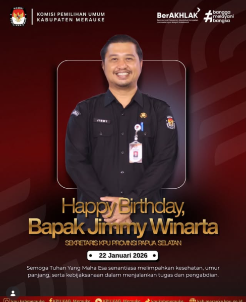 #TemanPemilih, Keluarga Besar Komisi Pemilihan Umum Kabupaten Merauke mengucapkan selamat ulang tahun kepada Bapak Jimmy Winarta, Sekretaris KPU Provinsi Papua Selatan. Semoga senantiasa dianugerahi kesehatan, kelancaran, dan kebijaksanaan dalam menjalankan tugas dan tanggung jawab, serta terus memberikan dedikasi terbaik bagi penguatan kelembagaan dan demokrasi di Papua Selatan. #KPUMelayani #KPUKabupatenMerauke ....