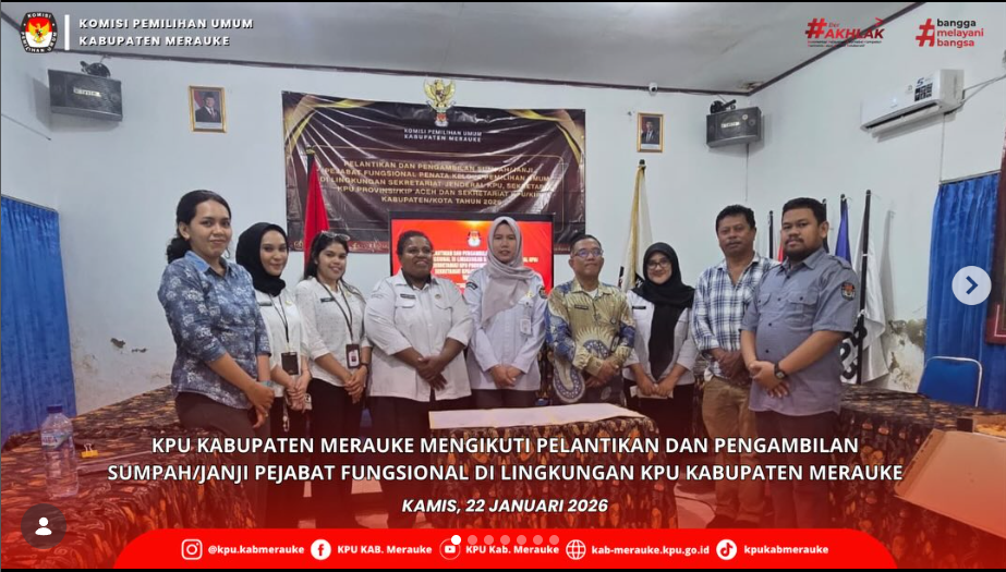 #TemanPemilih, KPU Kabupaten Merauke turut mengikuti Pelantikan dan Pengambilan Sumpah/Janji Pejabat Fungsional Penata Kelola Pemilihan Umum yang diselenggarakan oleh KPU Republik Indonesia, Kamis (22/01/2026). Prosesi pelantikan tersebut dipimpin oleh Sekretaris Jenderal KPU RI, Bernad Dermawan Sutrisno, dan disaksikan oleh Ketua KPU RI, Mochammad Afifuddin. Kegiatan diikuti secara daring melalui Zoom Meeting dari Kantor KPU Kabupaten Merauke dengan penuh khidmat. Pada kegiatan ini, satu orang pejabat fungsional dari Sekretariat KPU Kabupaten Merauke, Chairunnissa Arief, resmi dilantik dan mengikuti seluruh rangkaian acara. Turut hadir memberikan pendampingan, Sekretaris KPU Kabupaten Merauke, Kepala Sub Bagian Partisipasi Masyarakat dan SDM, serta jajaran Sekretariat KPU Kabupaten Merauke, sebagai wujud dukungan kelembagaan. #KPUMelayani #KPUKabupatenMerauke ....