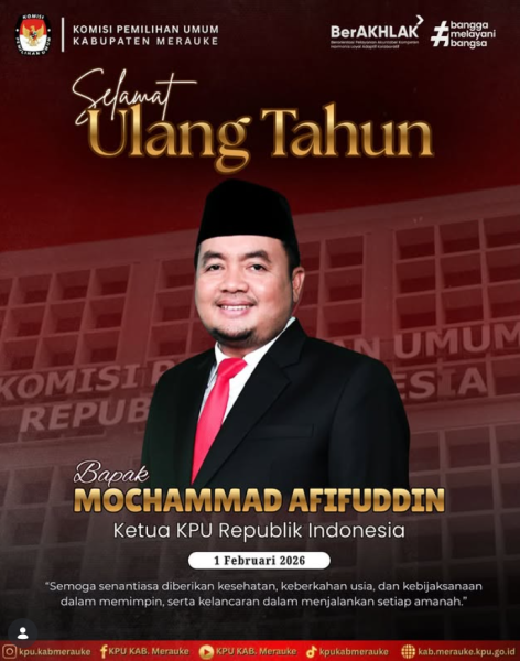 #TemanPemilih, Keluarga Besar KPU Kabupaten Merauke mengucapkan Selamat Ulang Tahun kepada Bapak Mochammad Afifuddin, Ketua Komisi Pemilihan Umum Republik Indonesia, (1/2/2026). Semoga senantiasa diberikan kesehatan, kekuatan, dan kebijaksanaan dalam memimpin, serta keberkahan dalam setiap pengabdian untuk demokrasi Indonesia. #KPUMelayani #KPUKabupatenMerauke ....