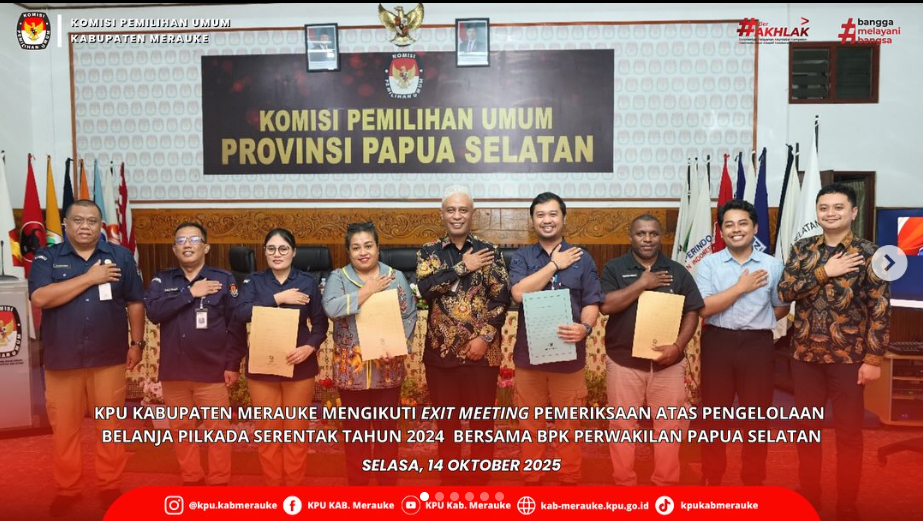 #TemanPemilih, Komisi Pemilihan Umum (KPU) Kabupaten Merauke mengikuti Exit Meeting bersama Badan Pemeriksa Keuangan (BPK) Perwakilan Papua Selatan terkait Pemeriksaan Kepatuhan atas Pengelolaan Belanja Pemilihan Kepala Daerah Serentak Tahun 2024 Periode Tahun 2024 s.d. Semester I Tahun 2025. Kegiatan ini berlangsung di Kantor KPU Provinsi Papua Selatan pada Selasa (14/10/2025).